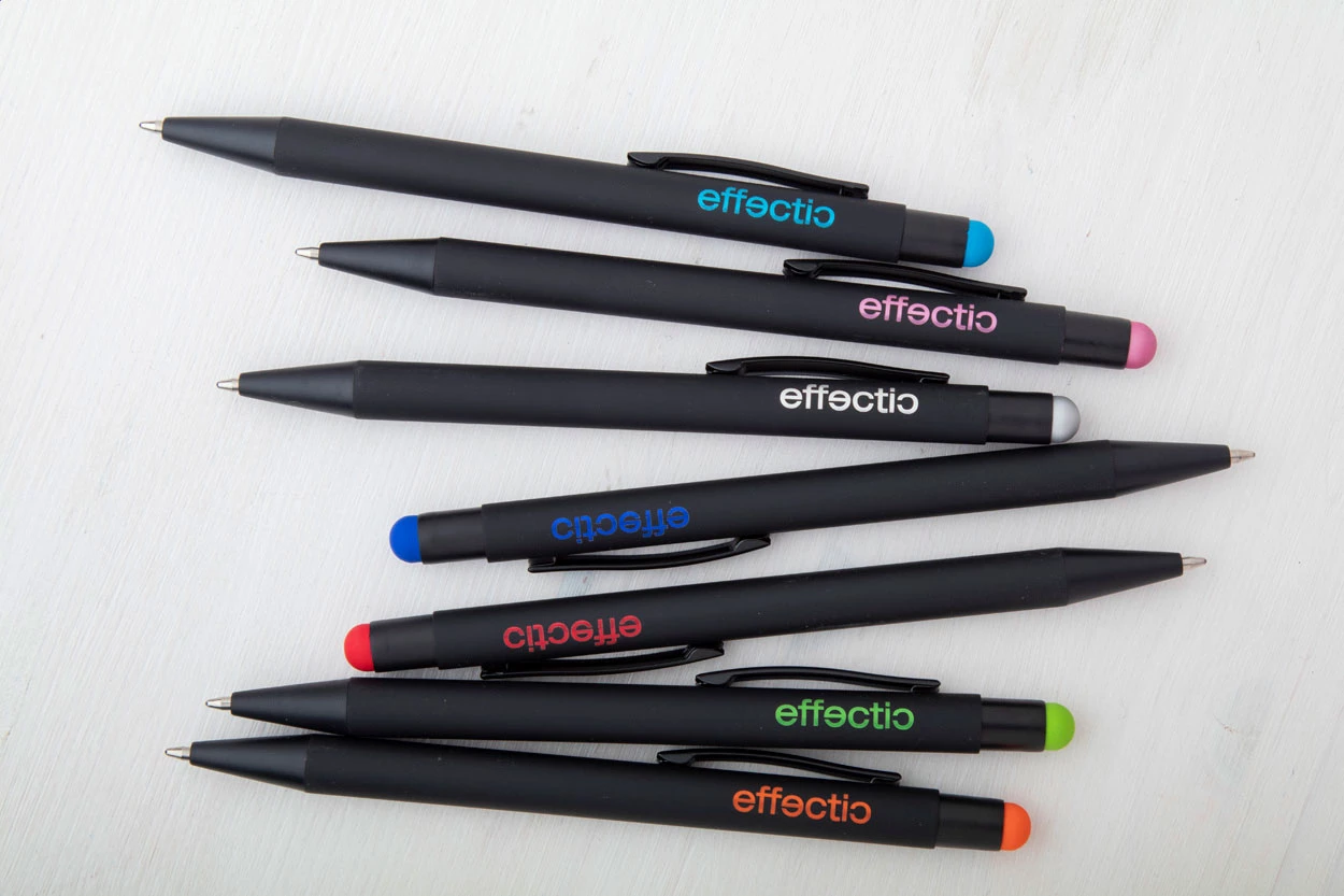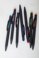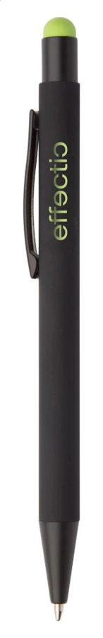 Aluminiowy długopis z końcówką do ekranów dotykowych i gumowanym wykończeniem. Posiada specjalny podkład pod lustrzany grawer w kolorze gumki. Niebieski wkład.