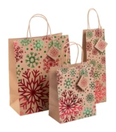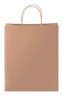 Torba prezentowa z papieru pakowego z recyklingu z bożonarodzeniowym wzorem wytłoczonym folią, ze skręconymi uchwytami i zawieszką prezentową. 140 g/m².