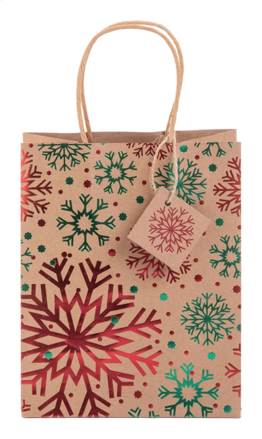 Torba prezentowa z papieru pakowego z recyklingu z bożonarodzeniowym wzorem wytłoczonym folią, ze skręconymi uchwytami i zawieszką prezentową. 140 g/m².