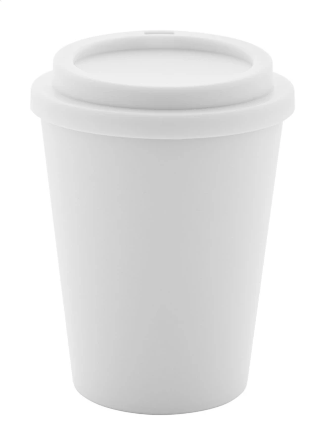 Kubek termiczny z podwójnymi ściankami, wykonany z tworzywa PP, z pokrywką do picia. Pojemność 300 ml.