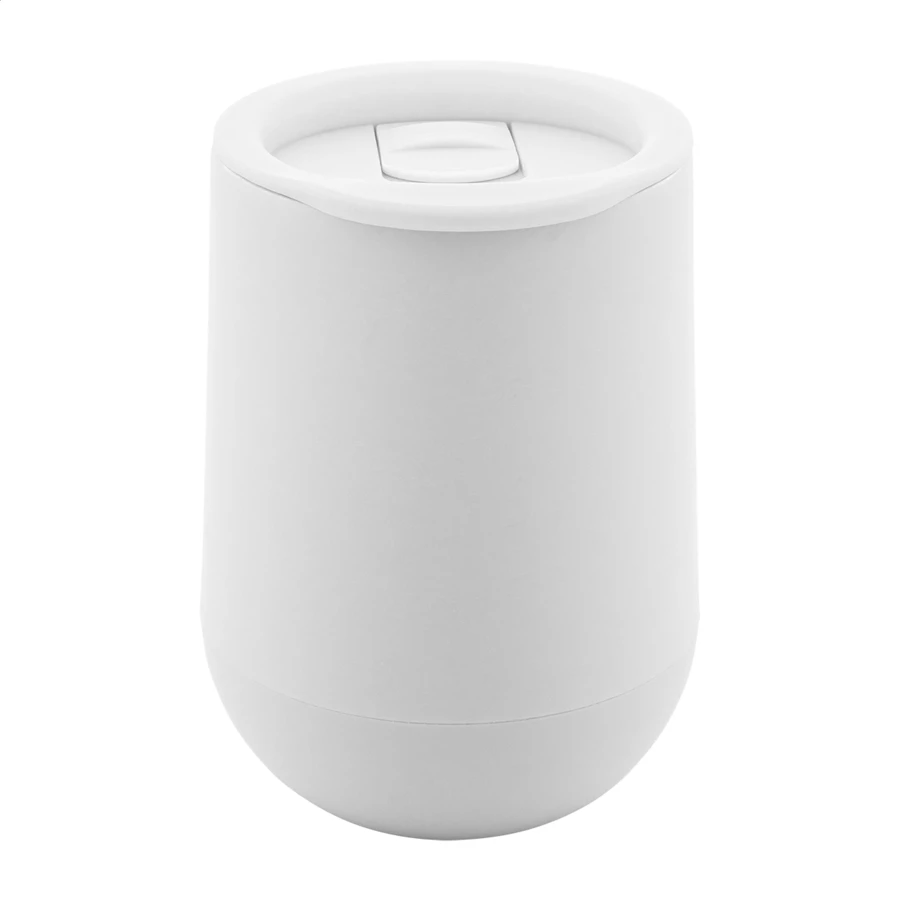 Izolowany kubek termiczny z podwójnymi ściankami, wykonany z tworzywa PP, z pokrywką do picia. Pojemność 300 ml.