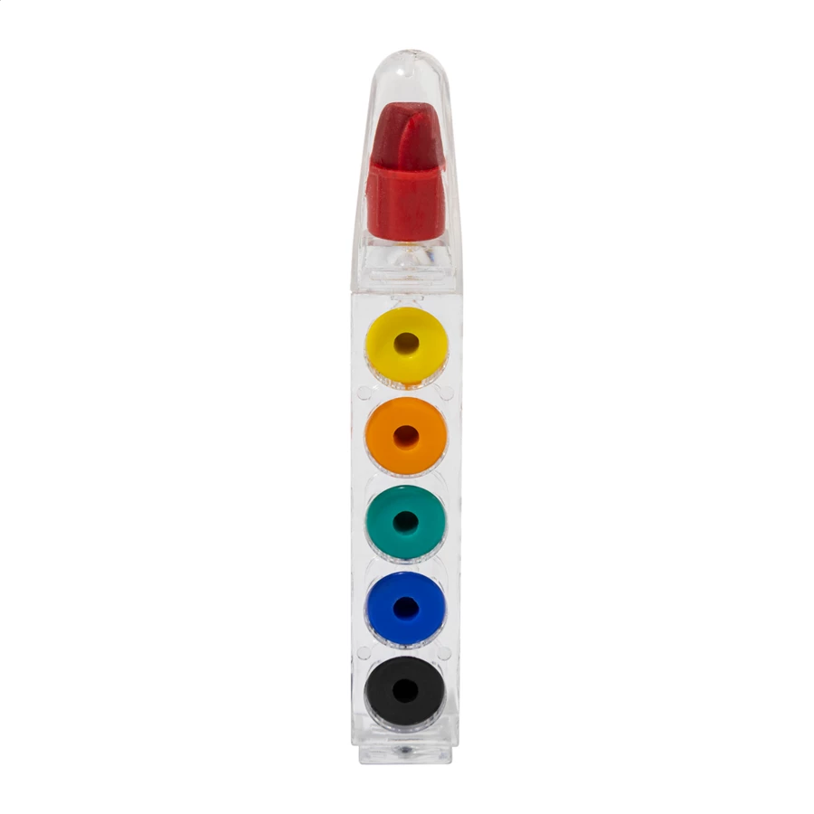 Kolorowe końcówki kredek świecowych (6 szt.) w przezroczystym pojemniku w kształcie długopisu.
