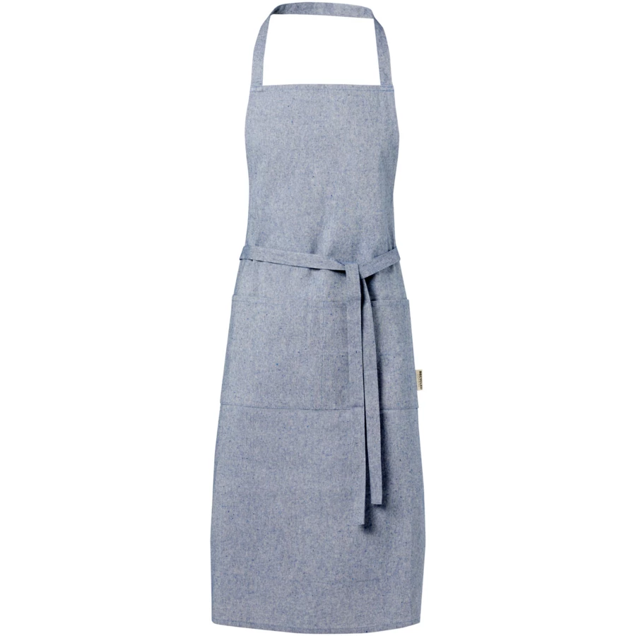 Fartuch wykonany z mieszanki bawełny i poliestru z recyklingu o gramaturze 200 g/m². Posiada 2 przylegające kieszenie o łącznych wymiarach 45 x 20 cm oraz wiązanie z tyłu o długości 1 m. Bawełna poddana recyklingowi pochodzi z tzw. wstępnych odpadów konsumpcyjnych wytwarzanych przez zakłady włókiennicze w trakcie procesu cięcia. Ze względu na właściwości bawełny z recyklingu możliwe są niewielkie różnice w kolorze. Ta cecha wyraźnie zwiększa autentyczność wyglądu. Długość paska na szyję: 55 cm.