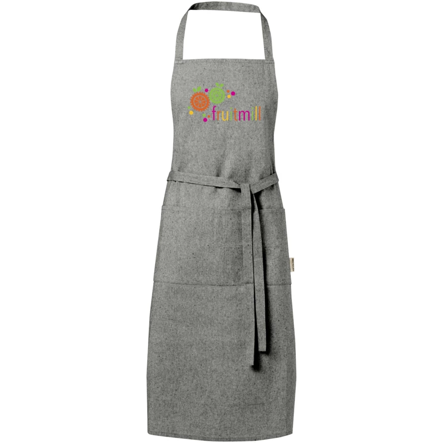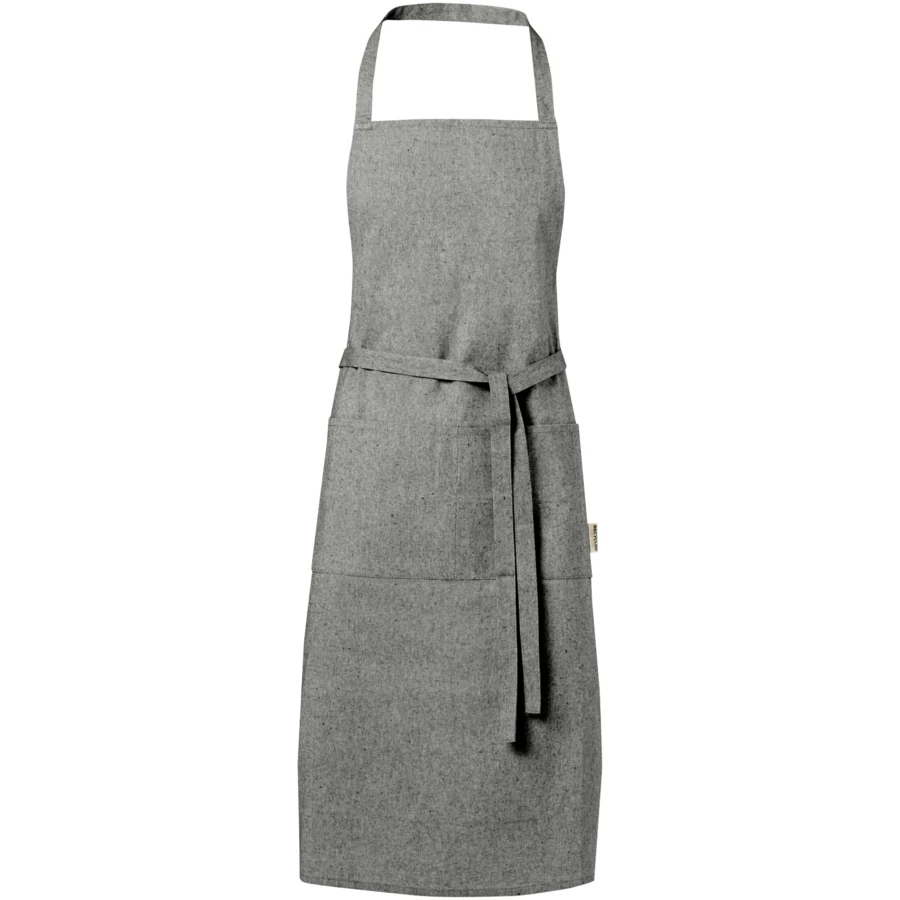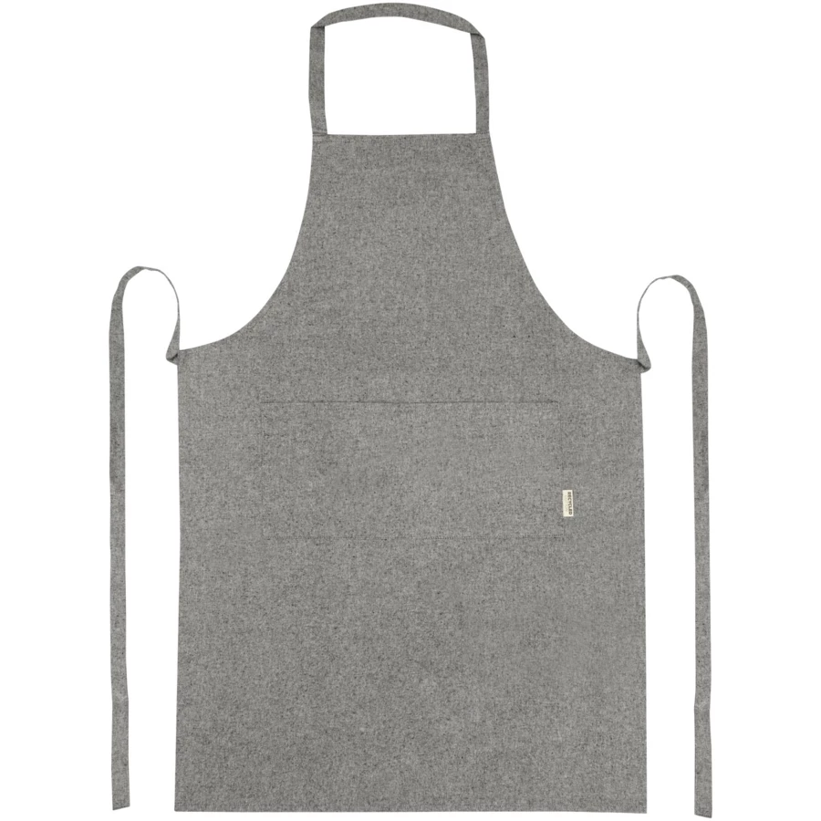 Fartuch wykonany z mieszanki bawełny i poliestru z recyklingu o gramaturze 200 g/m². Posiada 2 przylegające kieszenie o łącznych wymiarach 45 x 20 cm oraz wiązanie z tyłu o długości 1 m. Bawełna poddana recyklingowi pochodzi z tzw. wstępnych odpadów konsumpcyjnych wytwarzanych przez zakłady włókiennicze w trakcie procesu cięcia. Ze względu na właściwości bawełny z recyklingu możliwe są niewielkie różnice w kolorze. Ta cecha wyraźnie zwiększa autentyczność wyglądu. Długość paska na szyję: 55 cm.