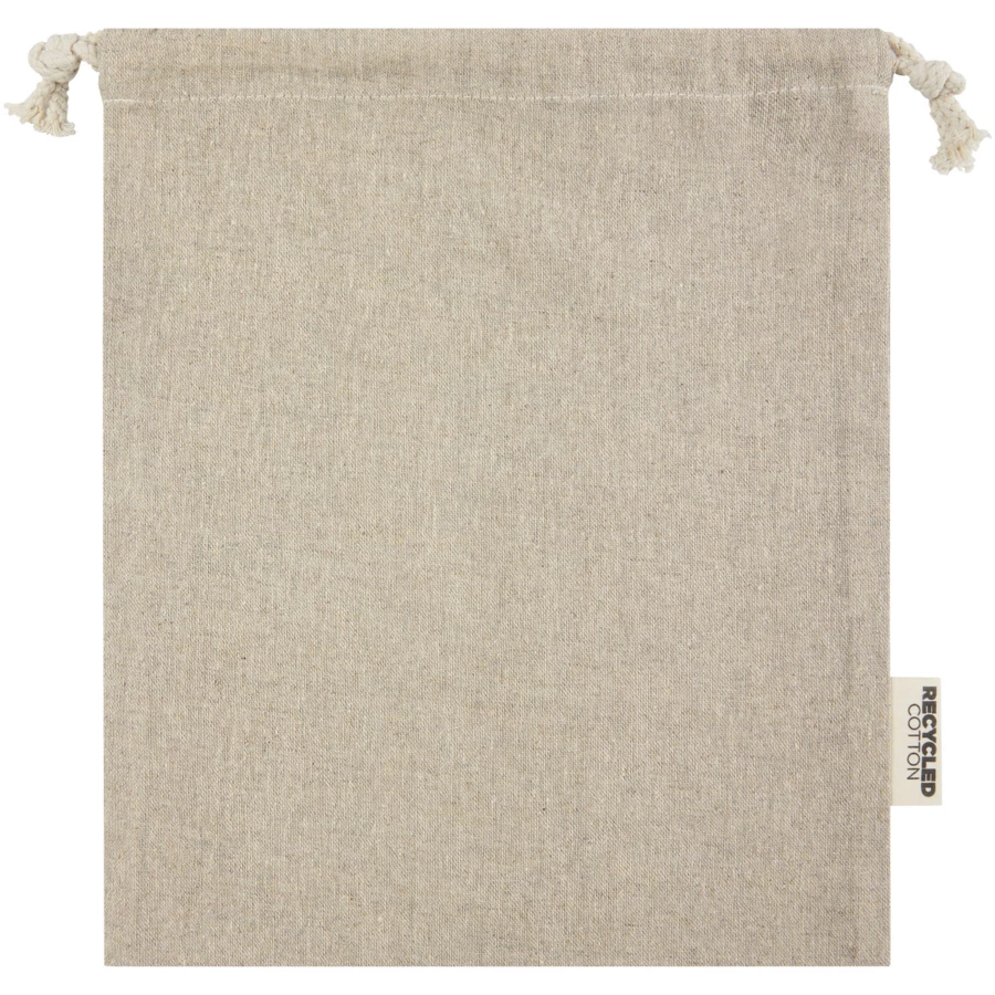 Torba upominkowa wykonana z bawełny z recyklingu z certyfikatem GRS z zamknięciem na sznurek bawełniany. Idealna do prezentów lub przechowywania przedmiotów. Wymiary: 25 x 30 cm.