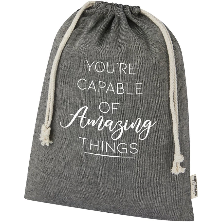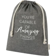 Torba upominkowa wykonana z bawełny z recyklingu z certyfikatem GRS z zamknięciem na sznurek bawełniany. Idealna do prezentów lub przechowywania przedmiotów. Wymiary: 30 x 42 cm.