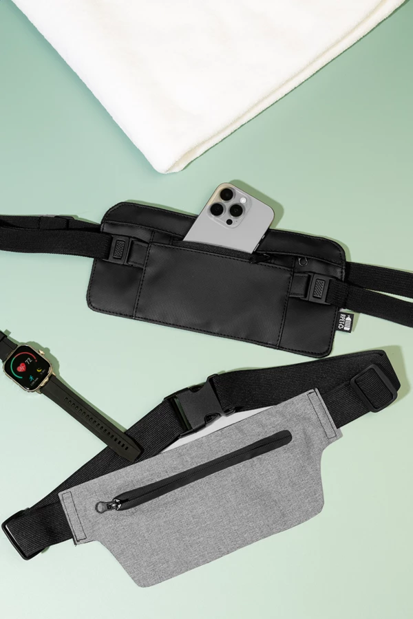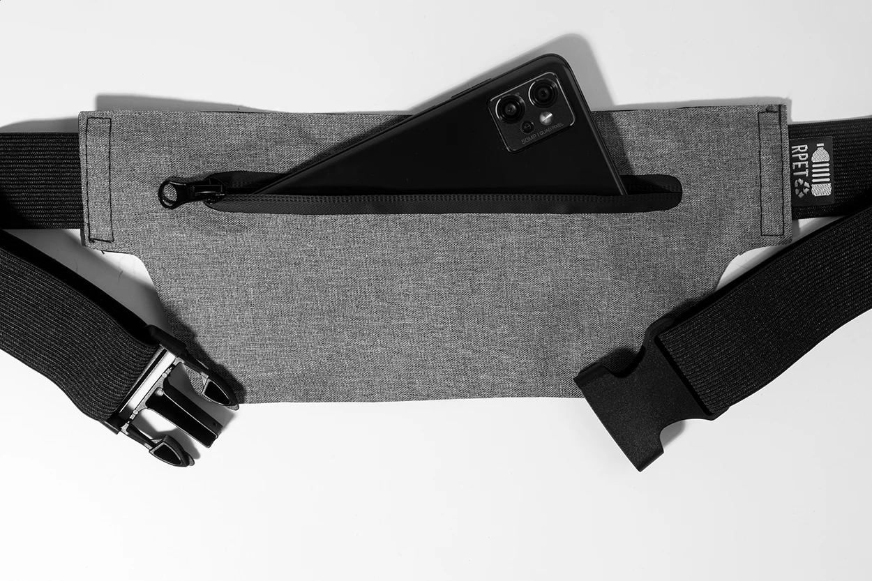 Smukła torba biodrowa z RPET z przegrodą zapinaną na zamek i regulowanym elastycznym paskiem. Poliester RPET 300D, z charakterystyczną metką RPET.
