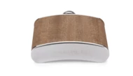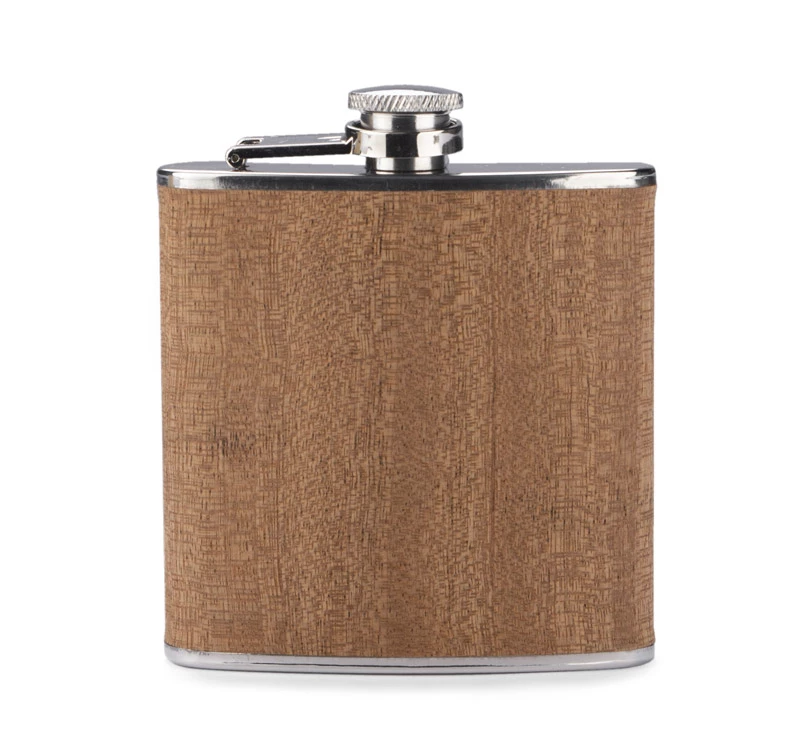 Piersiówka ze stali nierdzewnej o pojemności 200 ml z bezpiecznym zamknięciem. Wykończona jest bardzo cienką warstwą naturalnego drewna.