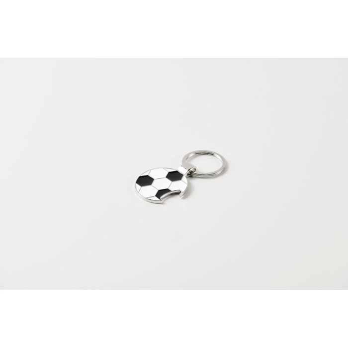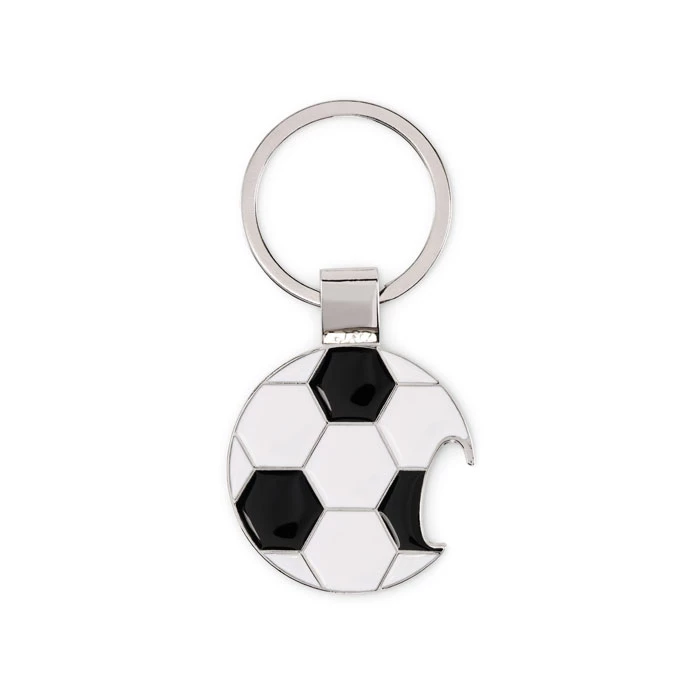 Brelok z otwieraczem do butelek w kształcie piłki nożnej wykonany ze stopu cynku z żelaznym pierścieniem.