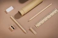 Piórnik ekologiczny wykonany z kraftowego papieru w kształcie tuby. W zestawie: papierowy długopis, drewniany: ołówek, temperówka, linijka oraz gumka do mazania.