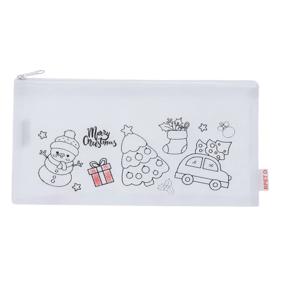 Piórnik z kolorowanką z motywem świątecznym na froncie, przegroda główna zamykana na zamek błyskawiczny, 5 kredek świecowych w komplecie, ikona RPET na metce, produkt wykonany z materiału non-woven RPET