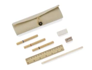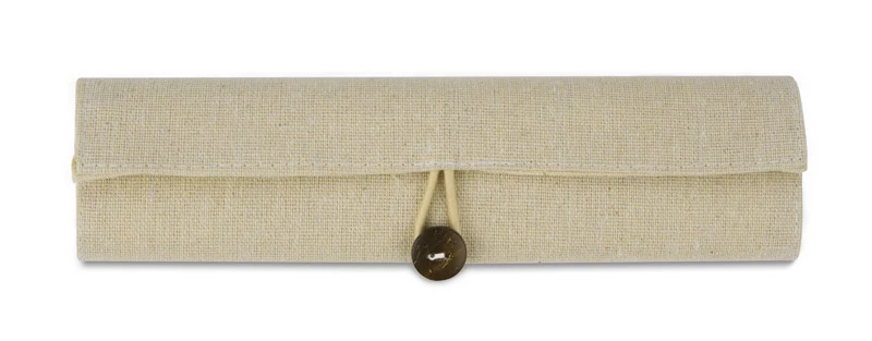 Piórnik ekologiczny wykonany z lnu. Zapinany na guziczek. W zestawie 3 ekologiczne długopisy (czarny, niebieski i czerwony), ołówek, temperówka, gumka do mazania, linijka. Logo wykonamy metodą nadruku.