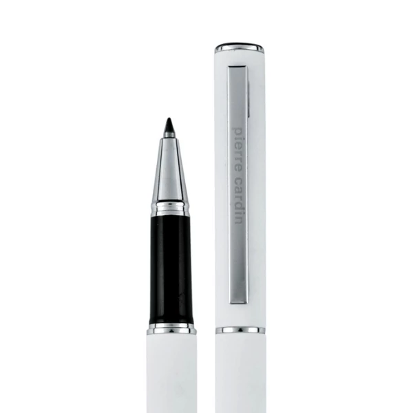 Luksusowe, aluminiowe pióro kulkowe z przyjemną w dotyku powierzchnią soft touch i srebrnymi detalami. Posiada wysokiej jakości niemiecki wkład Schneider w kolorze niebieskim, z końcówką 0,5 mm oraz funkcję touch pen. Zapakowany w eleganckie etui prezentowe z certyfikatem autentyczności Pierre Cardin.