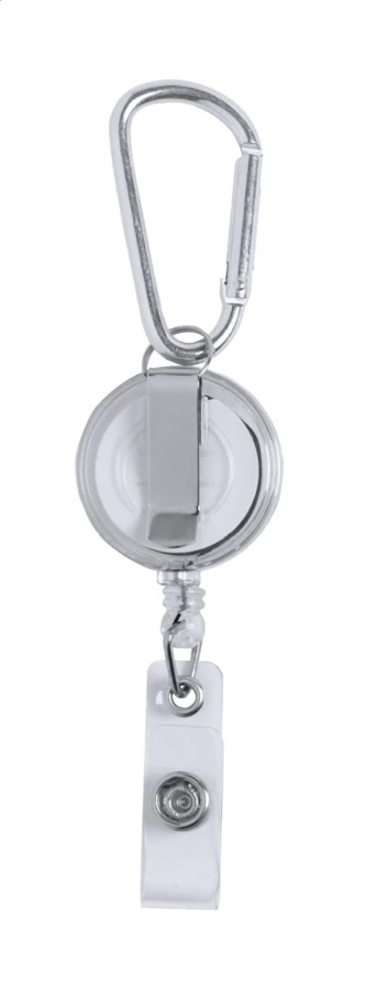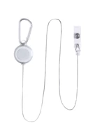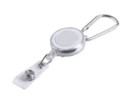 Plastikowy uchwyt na identyfikator z teleskopową linką, aluminiowym karabińczykiem i zapięciem zaciskowym.