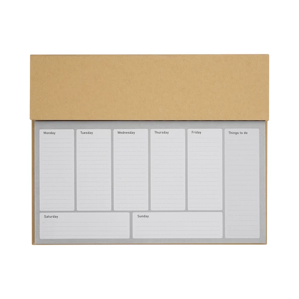 Planner na biurko w sztywnej oprawie. Zawiera 100 kartek z nadrukiem dni tygodnia i listą spraw do zrobienia (80 g/m2), drewnianą linijkę, długopis i papierowe znaczniki (25 sztuk w czterech kolorach, o gramaturze 75 g/m2).