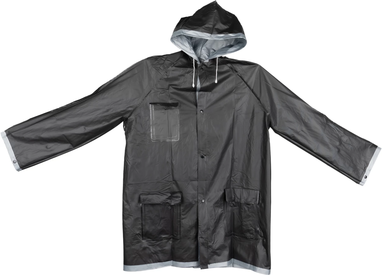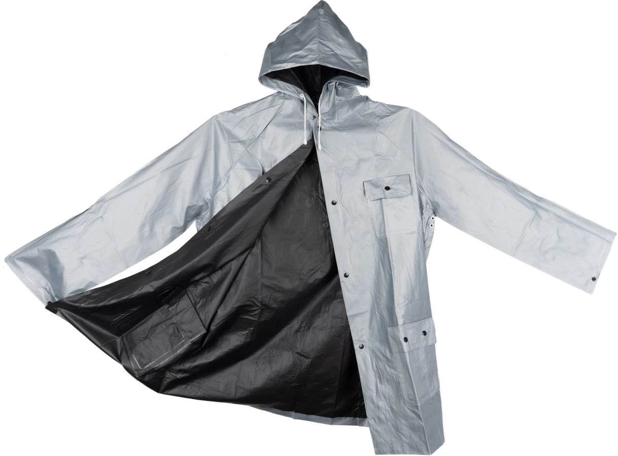 Dwustronny płaszcz przeciwdeszczowy NANTERRE, posiada kaptur oraz kieszenie. Płaszcz na deszcz zapinany na zatrzaski, wykonany z plastiku. Dostępny w kilku kolorach i w rozmiarze XL. Wymiary pleców płaszcza - 103 x 60 cm.