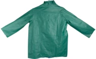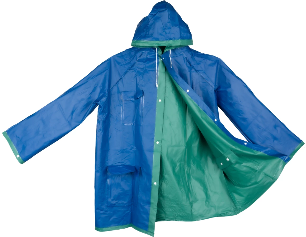 Dwukolorowa, dwustronna kurtka przeciwdeszczowa XL, z PVC (bez ftalanów), z zatrzaskami i kapturem. Wymiary pleców kurtki 103 x 60 cm.