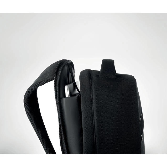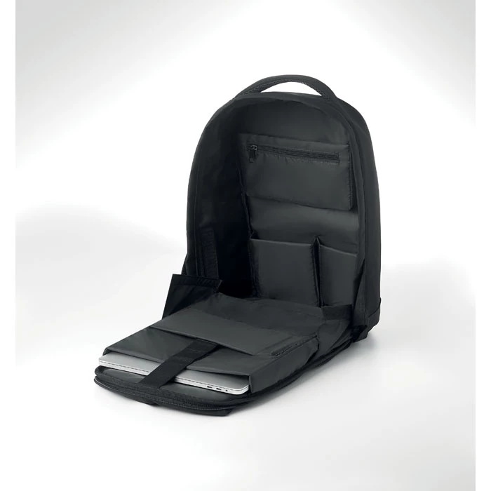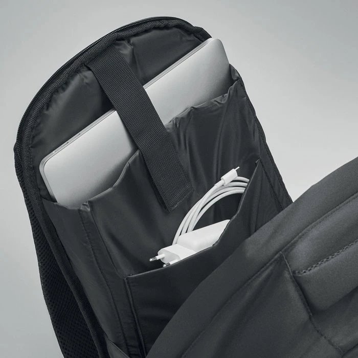 Plecak 600D RPET z wyściełanym paskiem na ramię z główną przegrodą wewnętrzną. Zawiera jedną wewnętrzną przegrodę na laptopa 13 cali. Główna komora zapinana na zamek z tyłu dla większego bezpieczeństwa.