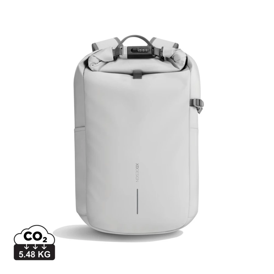 Plecak chroniący przed kieszonkowcami, zwijana przegroda główna i zamek szyfrowy wzmocniony stalą umożliwiający całkowite zamknięcie plecaka, zamek może posłużyć również do przypięcia plecaka do stałego obiektu, ukryte kieszenie do przechowywania dokumentów i kart kredytowych z tyłu torby oraz w pasku na ramię z ochroną RFID, kieszeń boczna, odpinana elastyczna siatka na sprzęt sportowy w komplecie, wewnątrz usztywnione przegrody na laptopa 16" lub tablet, siateczkowe kieszenie na inne przedmioty osobiste, całkowita zawartość materiałów z recyklingu obliczona w oparciu o wagę całkowitą przedmiotu: 11%, wzór zastrzeżony®
