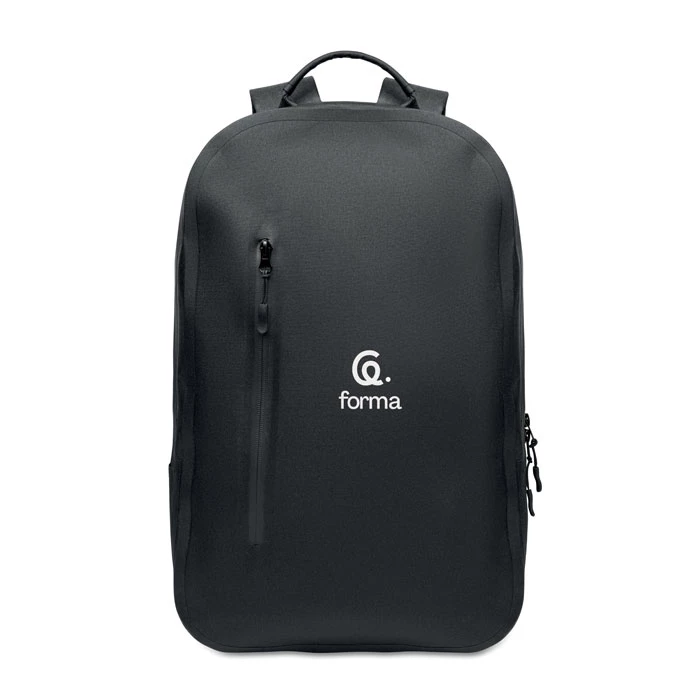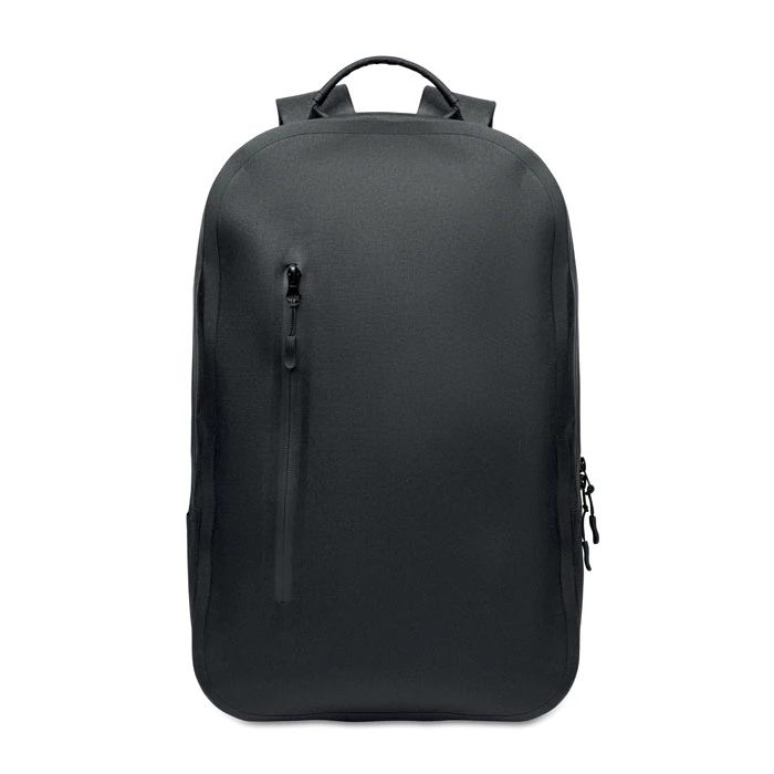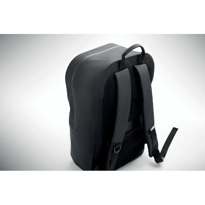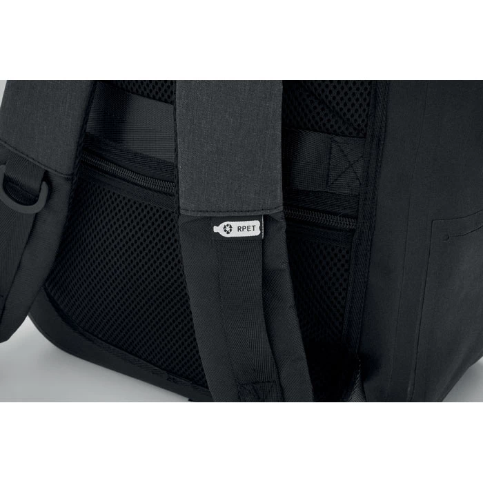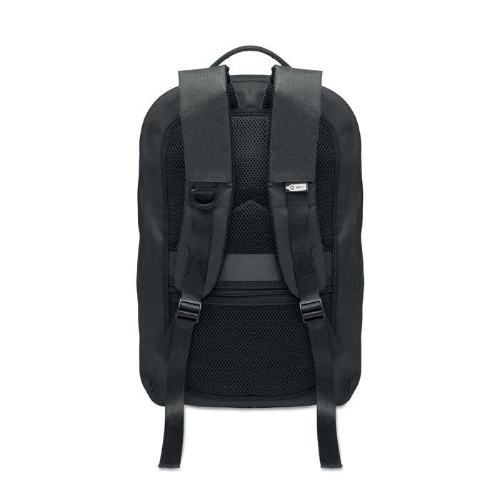 Plecak na laptopa 16'' z poliestru 300D RPET i podszewką z poliestru 210D. Wodoodporny materiał. Ukryta kieszeń zapinana na zamek i uchwyt na walizkę z tyłu. Wyściełana wewnętrzna przegroda na laptopa, siatkowy tył i pasek na ramię.