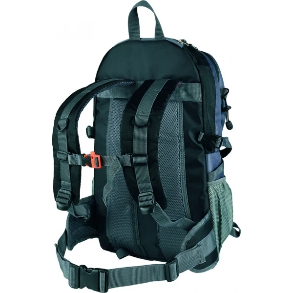 Plecak posiada watowane szelki oraz plecy, pas w talii, taśmy kompresyjne na bokach plecaka, siateczkowe kieszenie na butelki z obu stron, pętle, dwie kieszenie awaryjne, kieszeń z przodu z klamrą, środkową kieszeń na zamek z przedziałką na drobiazgi, zapinaną główną kieszeń z przestronną główną komorą z oddzielną kieszonką wewnątrz. W zestawie również pomarańczowy gwizdek. Materiał: poliester 420D, PVC poliester 210D ripstop z pubacking, 210D poliestrowa podeszwka. Pojemność 31 l.