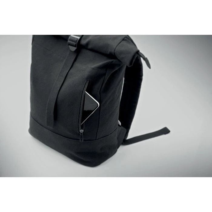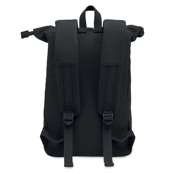 Zapinany na zamek 15-calowy plecak na laptopa typu rolltop z bawełny z recyklingu i poliestru z recyklingu (70%/30%). Przednia kieszeń zapinana na zamek. Wyściełane plecy i szelki. 340gr/m².