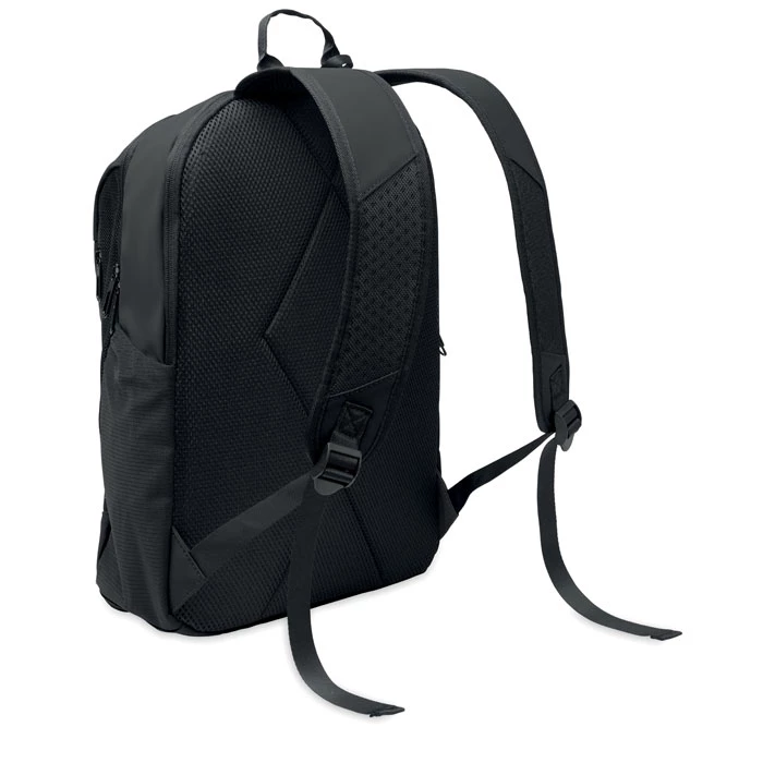 Plecak na laptopa 15 cali z miękkiego PU z wyściełanym tyłem i ukrytą komorą główną zapinaną na zamek. 1 przednia kieszeń zapinana na zamek, 2 przednie boczne kieszenie zapinane na zamek i 2 boczne kieszenie z elastycznej siatki. Podszewka z RPET 210D.