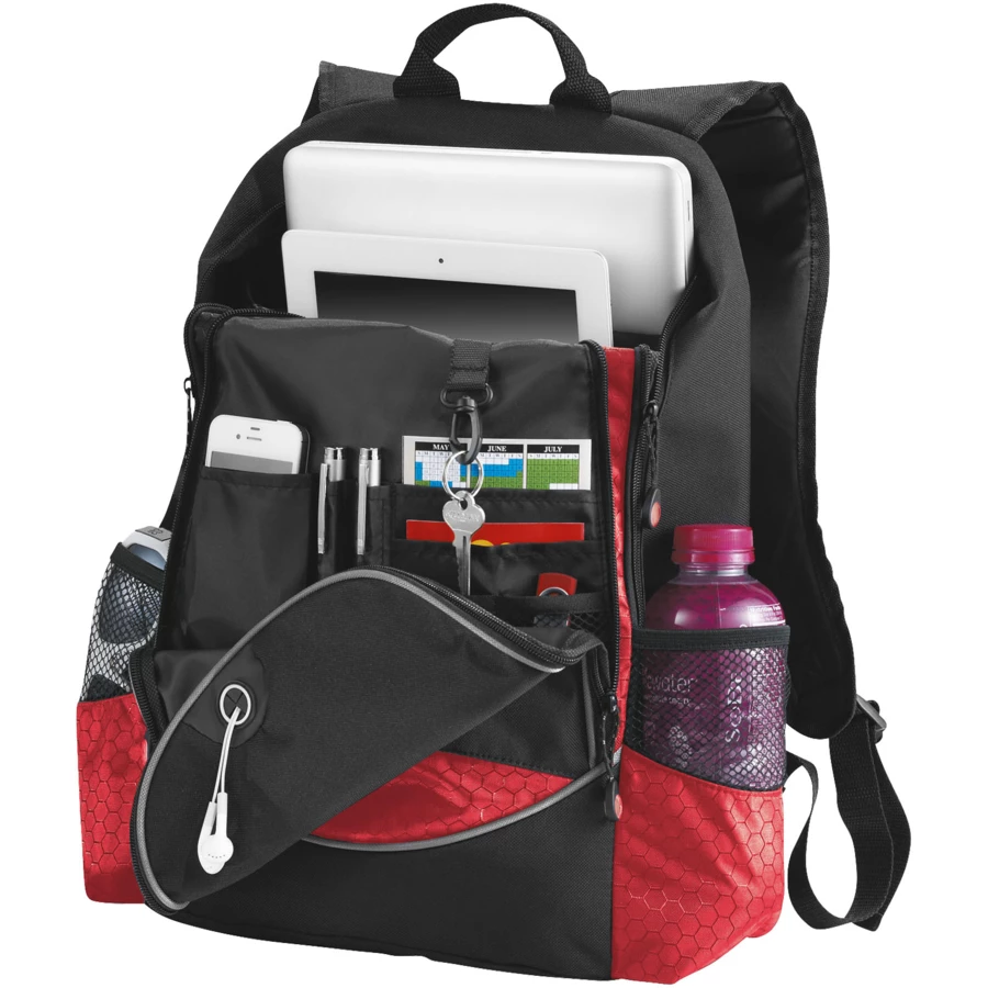 Zapinana na zamek przegroda główna zmieści większość laptopów 15", posiada dodatkowo wyściełaną przegrodę na iPad lub tablet. Duża kieszeń przednia, zapinana na zamek, posiada przegródki oraz wyjście na słuchawki. Dwie boczne kieszenie. Wzmocniona rączka i regulowane, wyściełane szelki. Nie zawiera akcesoriów.