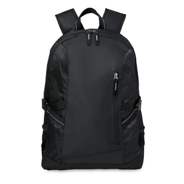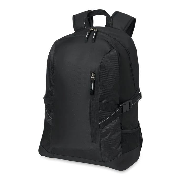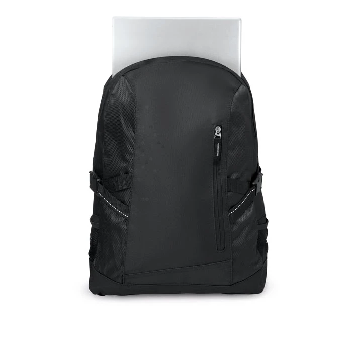 Plecak na laptop 15'' z poliestru 600D z wodoszczelnymi elementami. Zawiera 1 przegrodę na laptop 15'', 1 przednią kieszeń na zamek oraz 2 boczne kieszenie. Regulowane paski na ramiona.