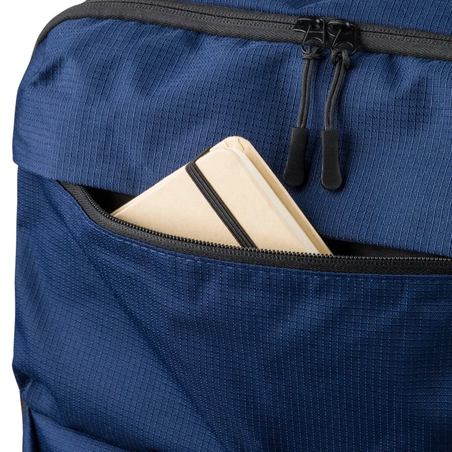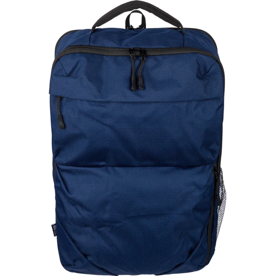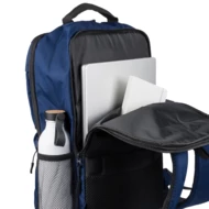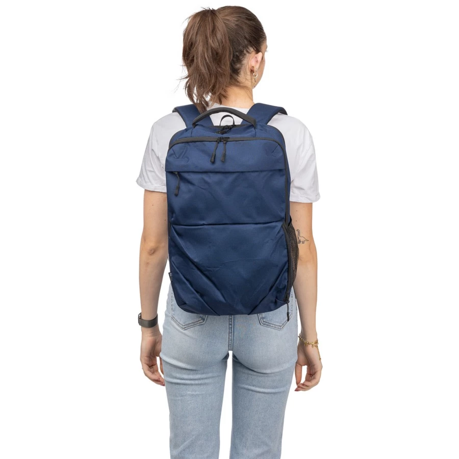 Plecak na laptopa 15" o pojemności 20 litrów, kieszeń główna zapinana na zamek, przegroda na laptopa 15", dwie małe kieszenie przednie zapinane na zamek, uchwyt ułatwiający noszenie, kieszeń boczna z siatką, wentylowane paski do noszenia na ramieniu, pasek do przymocowania do walizki, ikona OBP na metce, produkt wykonany z RPET 300D
