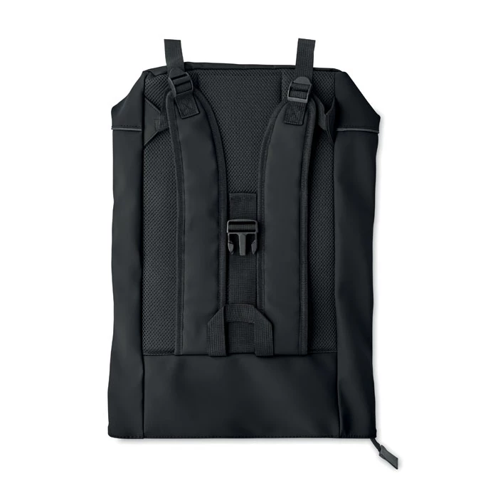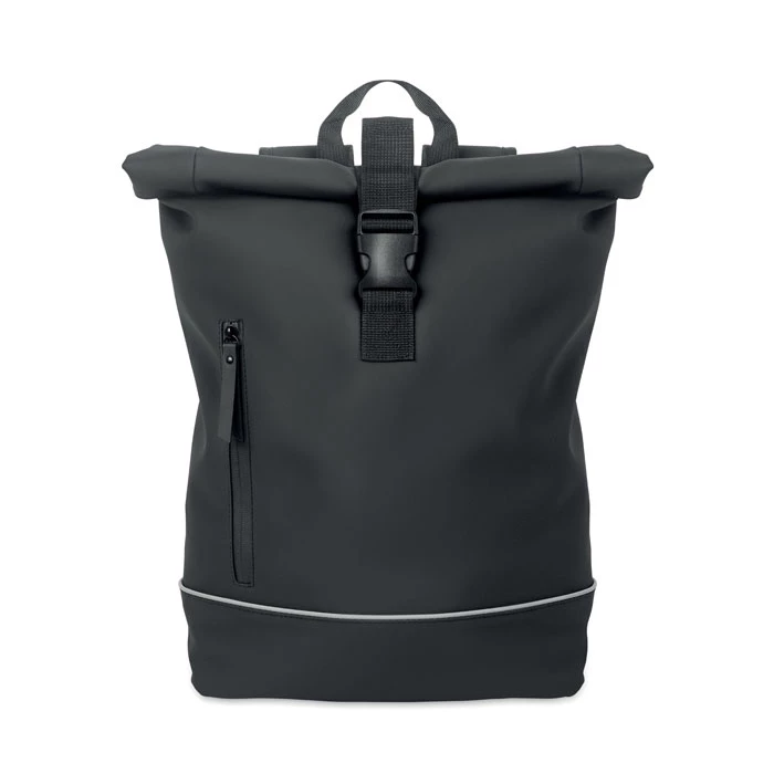 15-calowy plecak na laptopa z miękkiego PU z wyściełanym tyłem i wzmocnieniem podstawy z odblaskowym paskiem. Wodoodporna kieszeń przednia zapinana na zamek. Podszewka z poliestru 210D RPET.