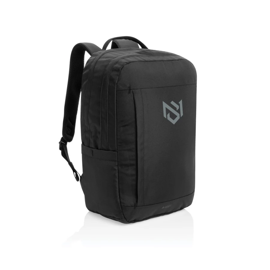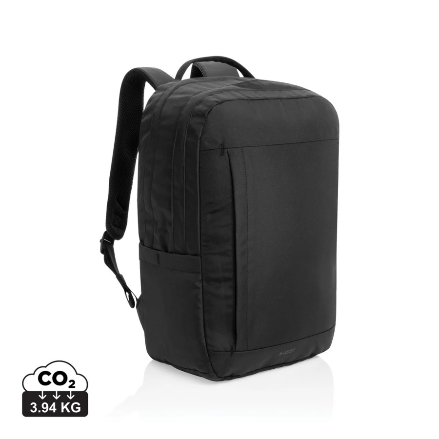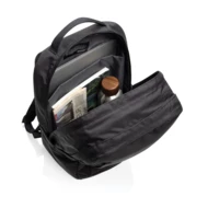 Plecak na laptopa 15,6" Edin AWARE™, wykonany w 100% z recyklingowanego poliestru rPET z podszewką rPET, przegroda na laptop do 16", przednia kieszeń na zamek, środkowa komora z kieszenią siatkową na zamek, kieszenie na paszport i długopisy, pasek do mocowania na walizce, górny uchwyt z taśmy, wszystkie elementy wykonane z materiałów z recyklingu, wbudowany znacznik AWARE™, 2% dochodu przeznaczone na Water.org, bez PVC
