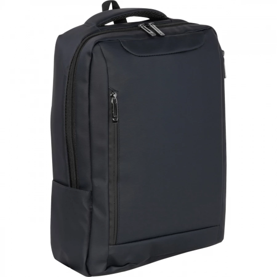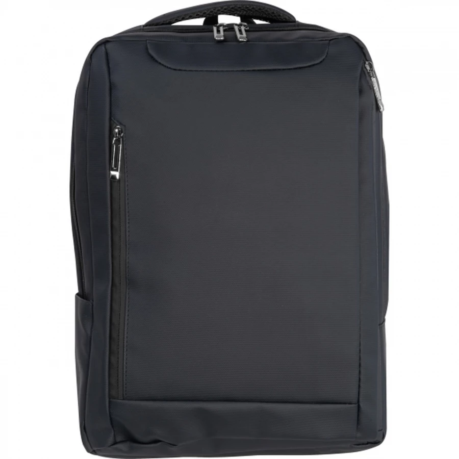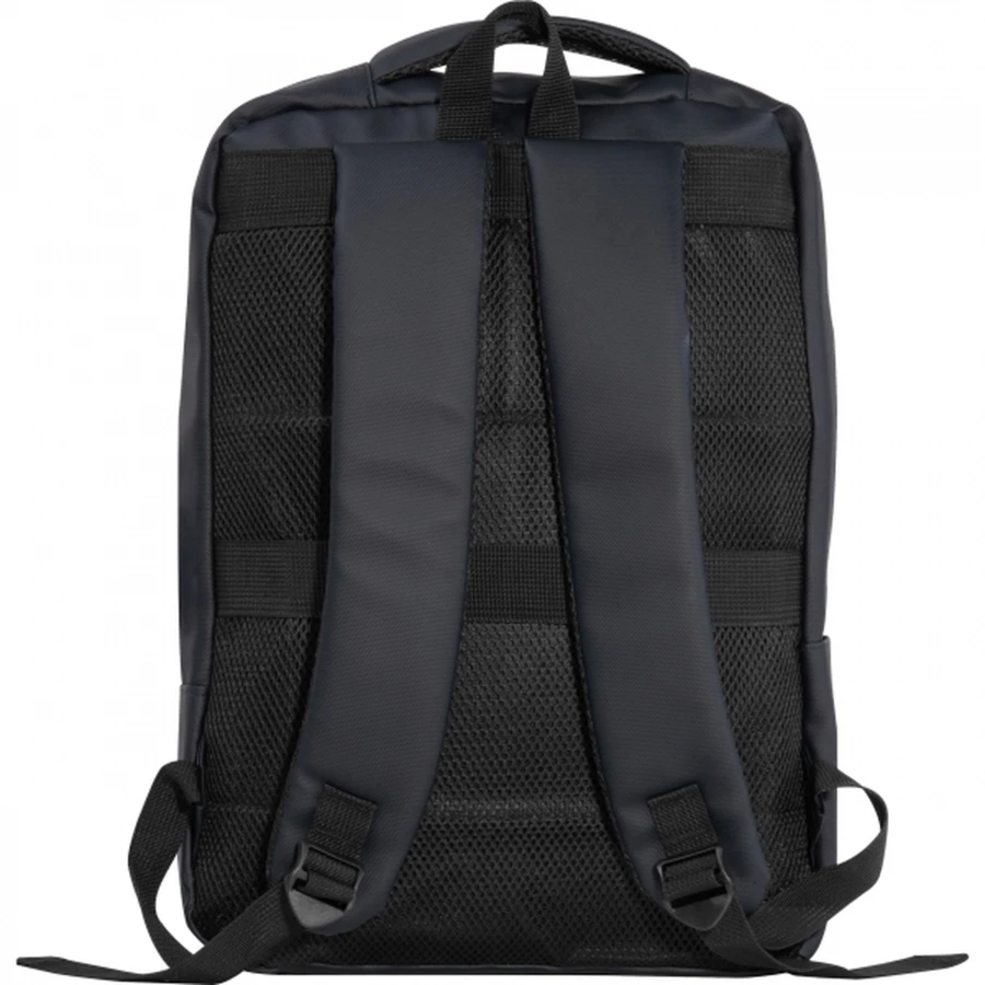 Plecak na laptopa wykonany z poliuretanu (PU), odpowiedni na laptopy 15-16 cali. Ma dwie przednie przegródki z zamkami błyskawicznymi, duży główny przedział z wyściółką na laptop, różne wewnętrzne kieszenie wsuwane, wyściełane paski na ramiona, uchwyt do noszenia i pasek z tyłu do mocowania do walizki.