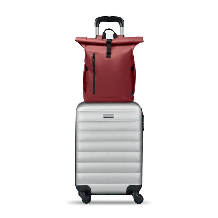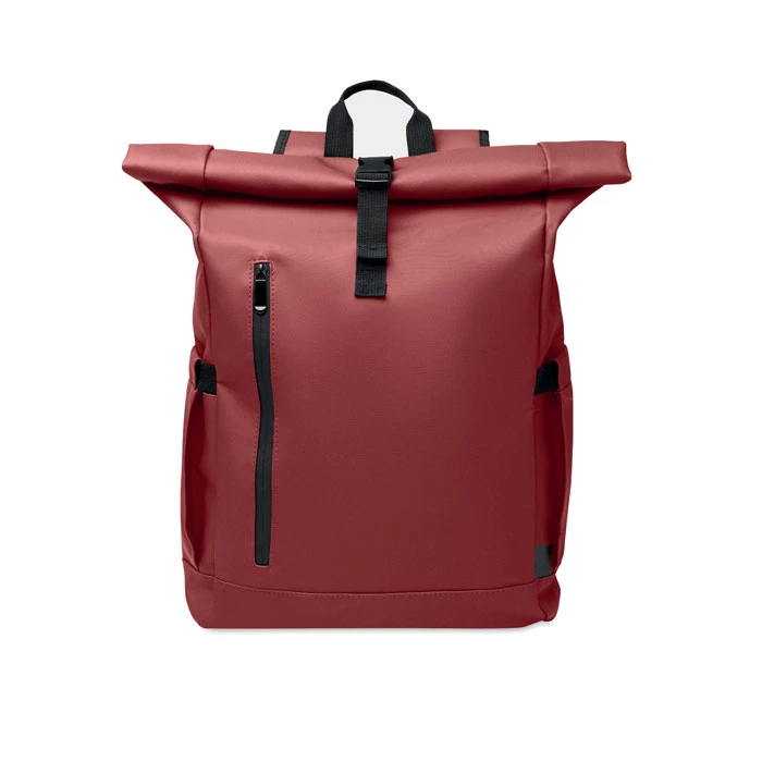Plecak na laptop typu rolltop z powlekanego PU poliestru 600D RPET i podszewką z poliestru RPET. Wyściełane plecy z kieszenią na zamek i paskiem na walizkę. Wyściełany pasek na ramię z wewnętrznym wykończeniem z siatki.
