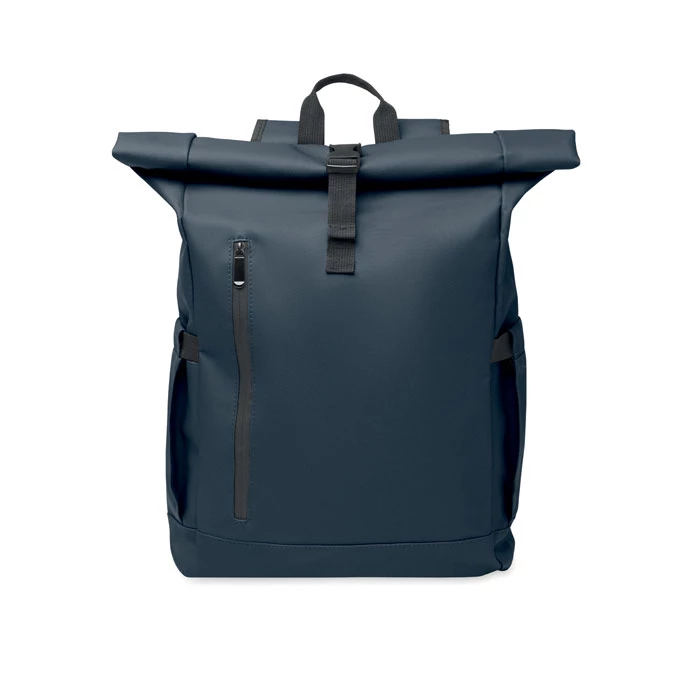 Plecak na laptop typu rolltop z powlekanego PU poliestru 600D RPET i podszewką z poliestru RPET. Wyściełane plecy z kieszenią na zamek i paskiem na walizkę. Wyściełany pasek na ramię z wewnętrznym wykończeniem z siatki.