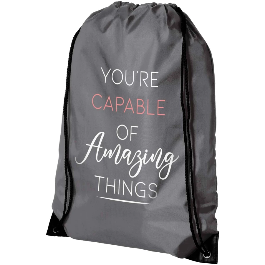 Plecak Oriole jest łatwy do wręczenia jako prezent promujący markę lub kampanię marketingową. Ten lekki plecak jest przyjazny dla budżetu, łatwy do noszenia na plecach lub na ramieniu i oferuje wystarczająco dużo miejsca na dodanie logo lub innych wiadomości. Sznurek ściągający ułatwia otwieranie i zamykanie, a materiał poliestrowy 210D jest mocny i trwały.