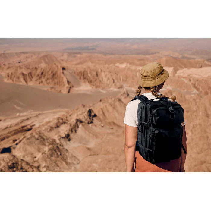 Plecak 50 l z 600D RPET z wyściełaną przegrodą na laptopa i przegrodami wewnętrznymi, przednimi kieszeniami na zamek, wyściełanymi siatką paskami i plecami, pasem biodrowym i elastycznymi wspornikami.