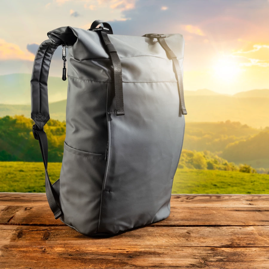Praktyczny plecak z rolowanym zamknięciem. Plecak posiada dwie małe przednie kieszenie zapinane na zamek, dwie boczne kieszenie oraz zamykaną na zamek, dużą komorę główną, wewnątrz której znajdują się przegródki na drobne akcesoria. Po zrolowaniu, plecak zapinany jest na dwie plastikowe klamry. Plecak posiada watowane plecy i szelki. Pojemność: zwinięty - 25l; rozłożony 32l.