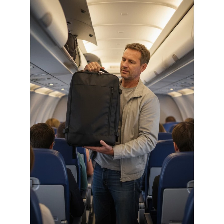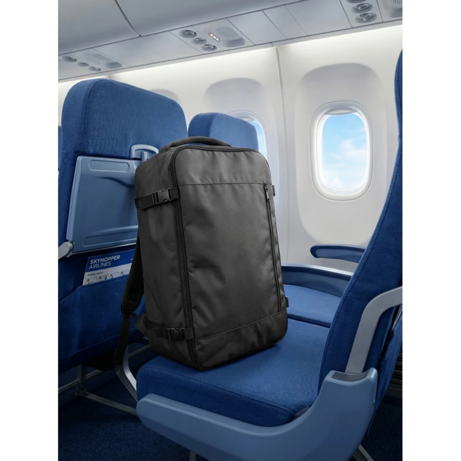Plecak podróżny w formie bagażu osobistego, kabinowy, przeznaczony do umieszczenia pod siedzeniem w samolocie, pojemność 20L, jedna przegroda główna zamykana na zamek błyskawiczny, wewnątrz kieszeń z siatki zamykana na zamek, na zewnątrz dwie kieszenie zamykane na zamek oraz kieszeń na butelkę, dwa regulowane paski kompresyjne ułatwiają stabilizację plecaka, na plecach pas umożliwiający zaczepienie o rączkę walizki, miękkie i regulowane paski na ramię umożliwiają dopasowanie długości