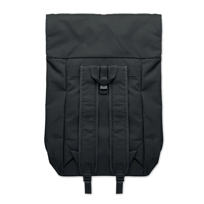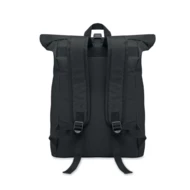 15-calowy zwijany plecak na laptopa typu rolltop z poliestru 600D z wyściełanym tyłem i wzmocnionym spodem. Przednia kieszeń zapinana na zamek. Podszewka 210D.