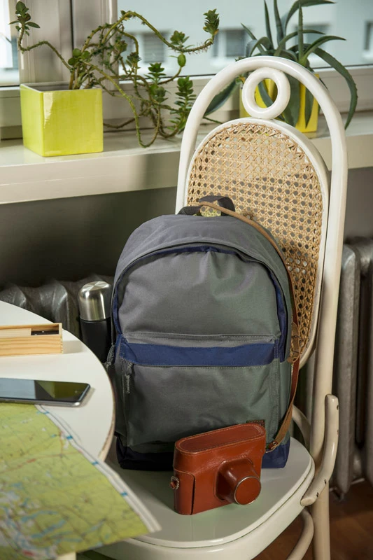 Plecak ENVI wykonany jest z poliestru 600D RPET, co czyni go bardziej przyjaznym środowisku. Posiada jedną komorę główną zapinaną dwoma suwakami. Dno plecaka oraz plecy są lekko usztywnione. Z przodu znajduje się spora kieszeń zapinana na zamek, która pomieści potrzebne drobiazgi. Z boku znajduje się otwarta kieszonka mieszcząca małą butelkę wody.