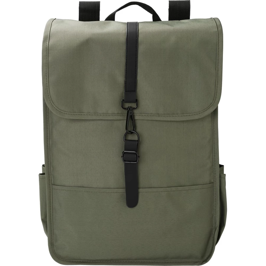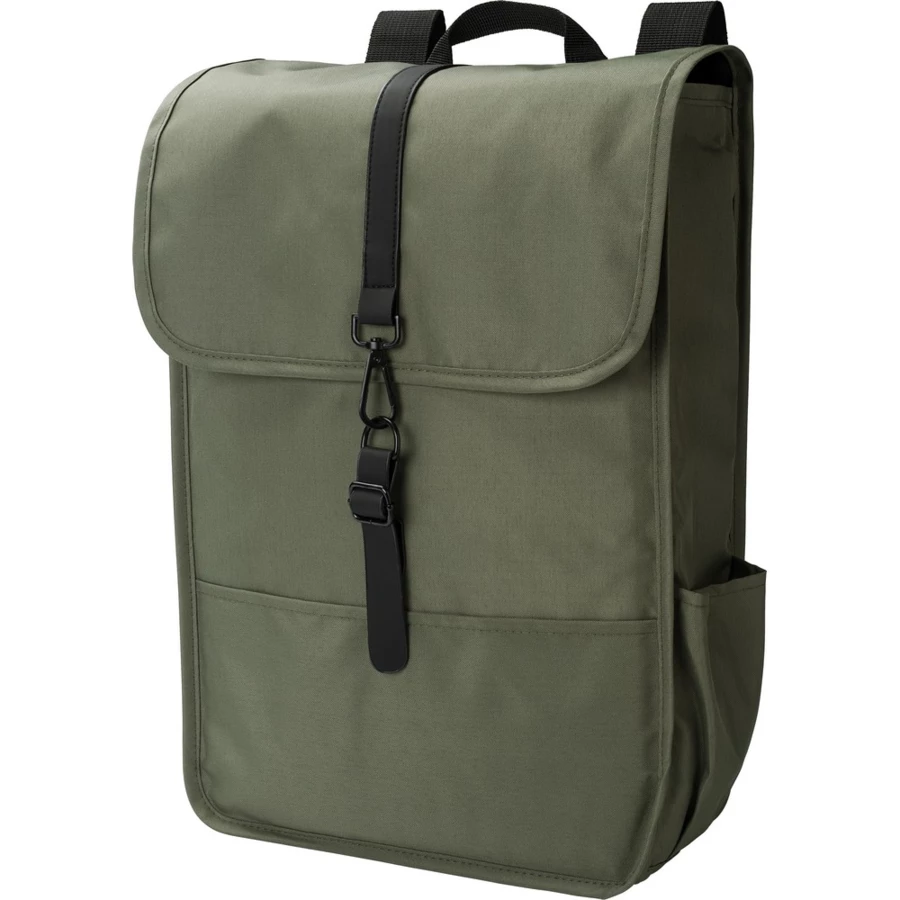 Plecak z klapą wykonany z RPET, dwie kieszenie boczne, przestronna przegroda główna, zamykany na klamrę