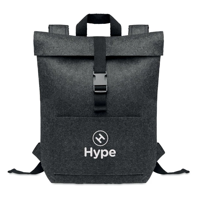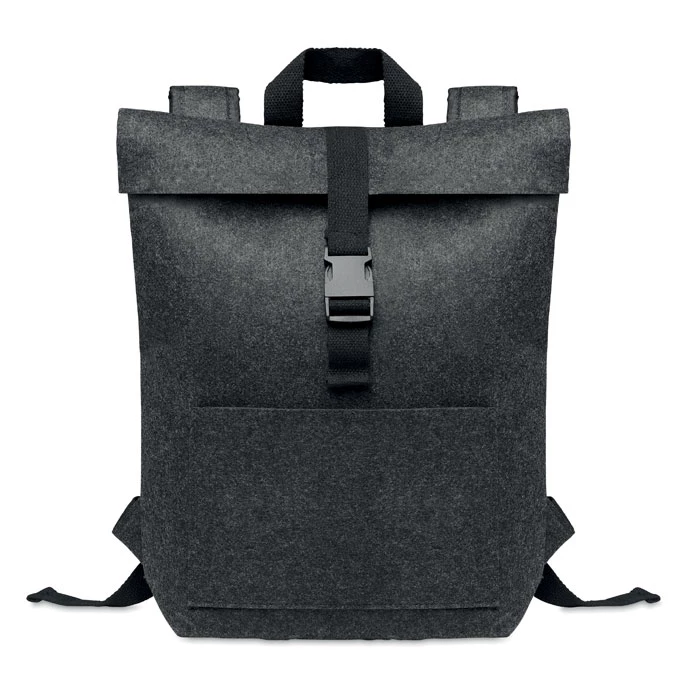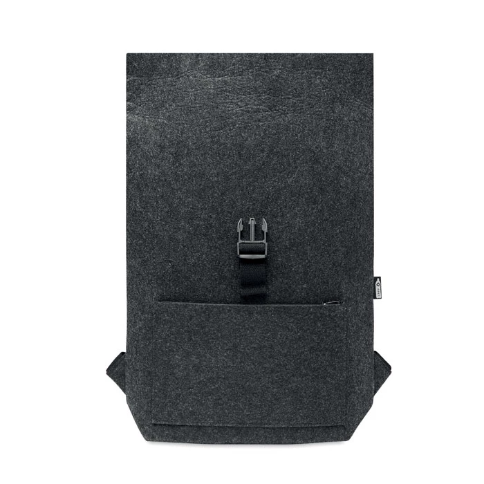 Plecak filcowy RPET z bawełnianym paskiem zapinanym na klamrę i kieszenią zapinaną na zamek z przodu. Posiada przegrodę na laptopa.