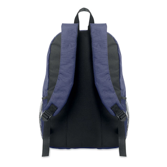 Plecak z poliestru 600D RPET z ozdobnym sznurkiem i przednią kieszenią zapinaną na zamek. Siateczkowe kieszenie po obu stronach.
