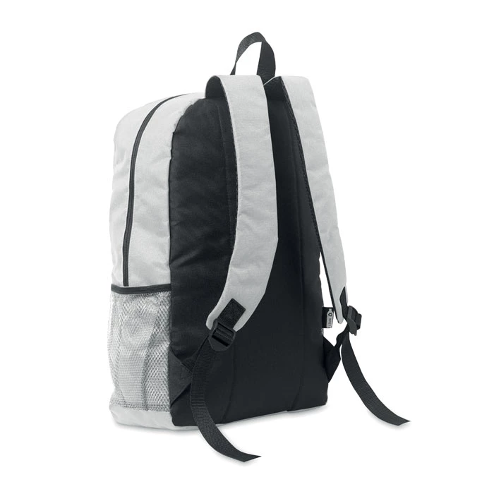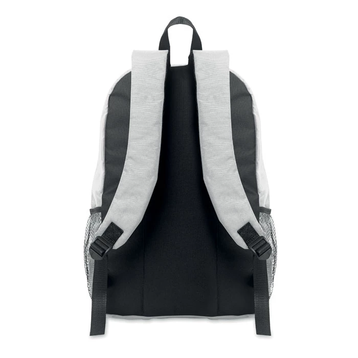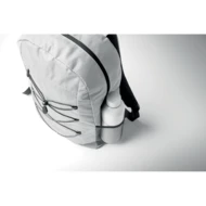 Plecak z poliestru 600D RPET z ozdobnym sznurkiem i przednią kieszenią zapinaną na zamek. Siateczkowe kieszenie po obu stronach.