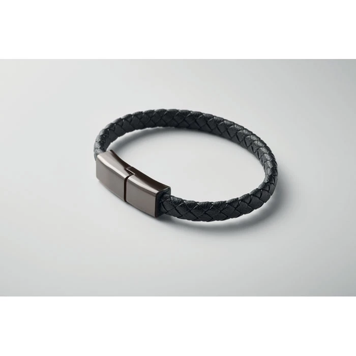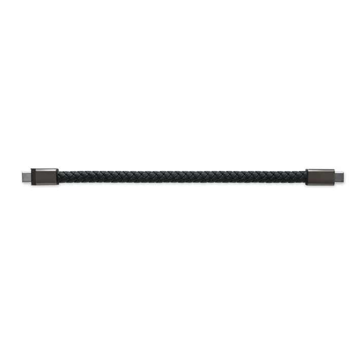 Bransoletka z kablem ładującym 60 W typu C do typu C, wykonana z PU z plecionym detalem ze stopu cynku. Obwód nadgarstka ok.: 21 cm.