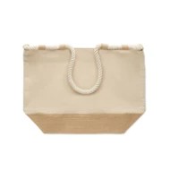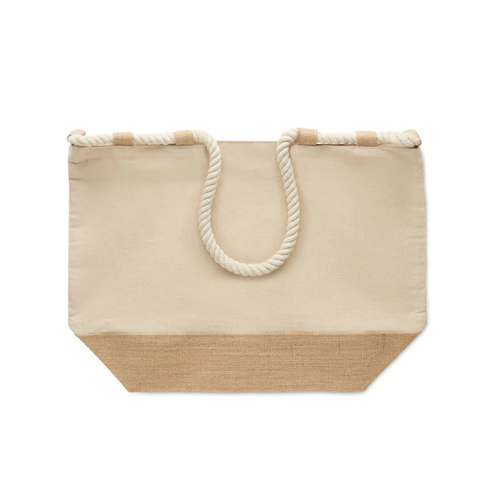 Torba plażowa z płótna bawełnianego 280 gr/m² i juty z uchwytami ze sznurka. Posiada zamek błyskawiczny, dno pokryte jutą i 10 jutowych pętli.