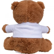 Mały pluszowy miś w białej koszulce wykonanej z poliestru z recyklingu.