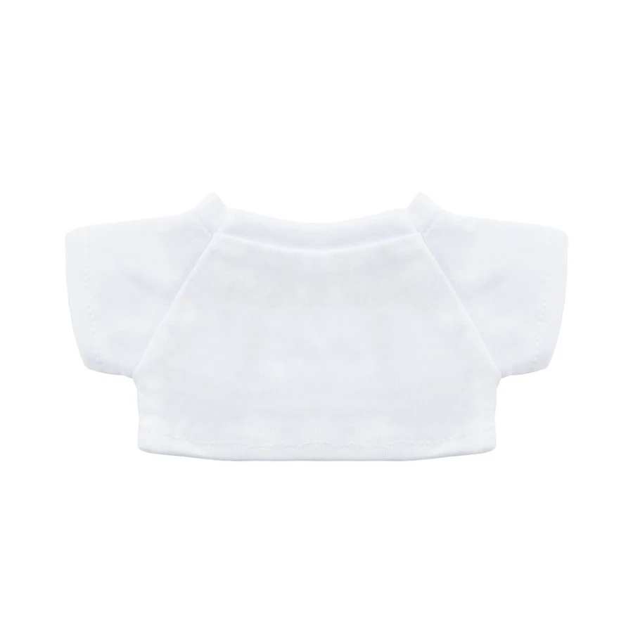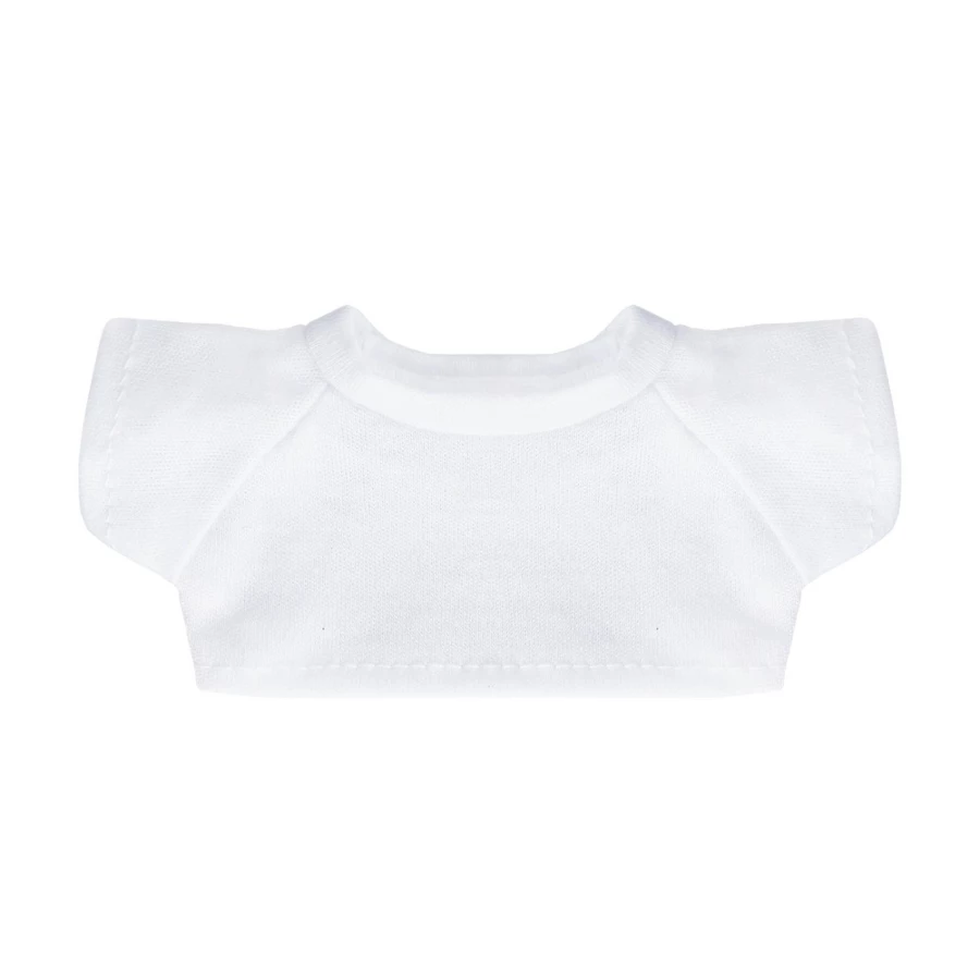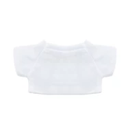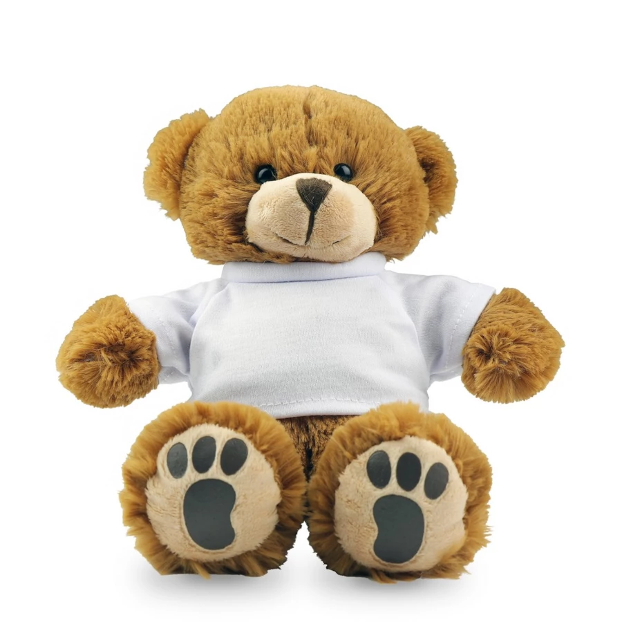Brązowy miś z białą koszulką pod nadruk (nieoznakowana koszulka pakowana oddzielnie), wykonany z pluszu pochodzącego z poddanych recyklingowi butelek PET, na życzenie można wymienić białą koszulkę na żółtą z weluru, zgodny z certyfikatem GRS (Global Recycled Standard)