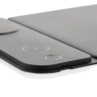 Podkładka pod mysz, ładowarka bezprzewodowa 3 w 1, magnetyczna ładowarka bezprzewodowa 15W, ładowarka bezprzewodowa 5W do słuchawek i drobnych akcesoriów, ładowarka bezprzewodowa 2,5W do smartwatchy (tylko iOS), wykonana z PU z recyklingu, działa z telefonami posiadającymi możliwość ładowania indukcyjnego, wejście 9V/3A, wyjście dla telefonu 9 V/1.1 A, 9 V/1.67 A, 15 W, wyjście dla słuchawek 5V/1A, 5W, wyjście smartwatcha 5V/0.5A, kabel 120 cm z TPE z recyklingu w komplecie, w pudełku z certyfikatem FSC®